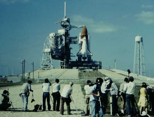 RSS Rollout: The Rotating Service Structure (RSS) is scheduled to be opened the afternoon before the launch. Seen at close range, the RSS is an enormous tangle of pipes, struts, and pylons...no more meaningful or attractive than an oil refinery. But the huge RSS has a trick that refineries can't match. Imperceptibly at first, it pivots open along a gigantic hinge. Discovery is gradually revealed. It is gleaming white, totally flawless, utterly pristine. Seen face on, the elegance of the entire Shuttle stack...Orbiter, External Tank, and Solid Rocket Boosters...is overpowering. This is a little-realized advantage of aerodynamic spacecraft...beauty becomes a necessity, not a frivolous option. Sunset: Hundreds of photographers, representatives of the world press corps, pile out of NASA buses. I, in my reporter disguise, am among them. Before us lies the narrow Mosquito Lagoon, bright with flashes of the setting sun, dotted with wading birds and waterfowl. Across the water, Discovery sits at Launch Pad 39-B. The sun's slanting descent is bringing it to a rendezvous with Discovery. It touches the horizon. Shutters click more frequently when flocks of wild birds pass in front of the waiting spacecraft. Their cries and the surf behind us provide the only other sounds. From this viewpoint, Kennedy Space Center looks primordial, untouched...except for the spacecraft silhouetted incongruously against the golden horizon. |